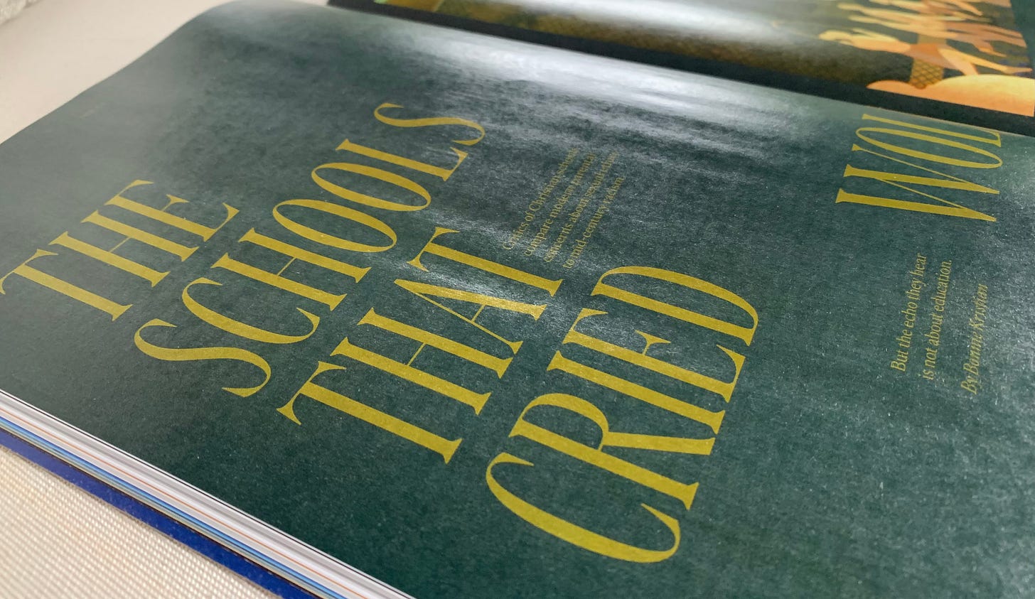 By now Christianity Today’s May-June issue should have made it to every print subscriber’s mailbox, which means an article I’ve had in the works for literally years is finally, finally out in the world. It’s called “The schools that cried wolf,” and it’s about the history of segregation academies in America and our schooling debates today.
