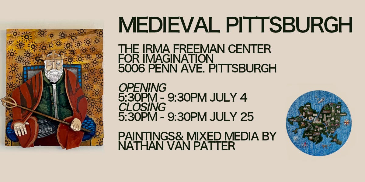 Also, repurposing this section this week for an invitation: If you’re in Pittsburgh, please come to my friend’s art show, ideally the opening reception on July 4.